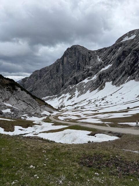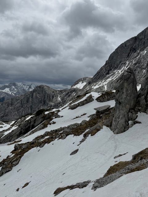 Puis on va marcher : d’abord sur un petit sentier où on marche dans la neige; puis un grand sentier qui descend vers un autre sommet: KREUZECK (1650m). De là, on redescend dans la vallée avec des oeufs. On s’est bien organisés car au moment de redescendre il recommence à pleuvoir.