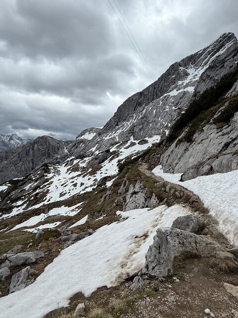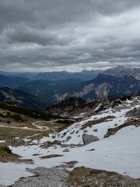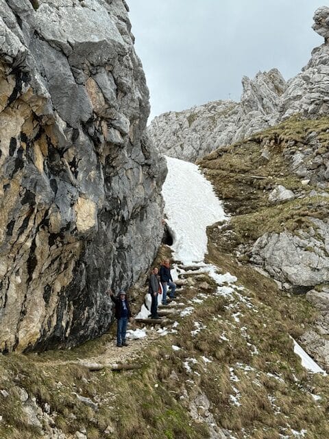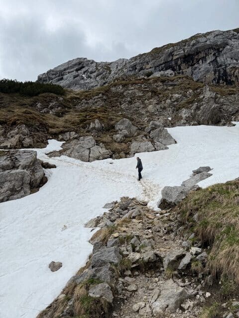 Then we go hiking: first on a small path which is covered in snow at some points ; then a larger path which goes down to the KREUZECK (1650m). From there we go back down to the valley with another cable car. We are lucky because as soon as we begin to go back down, it begins to rain again.