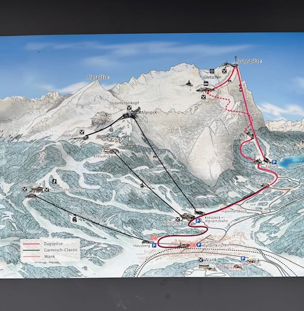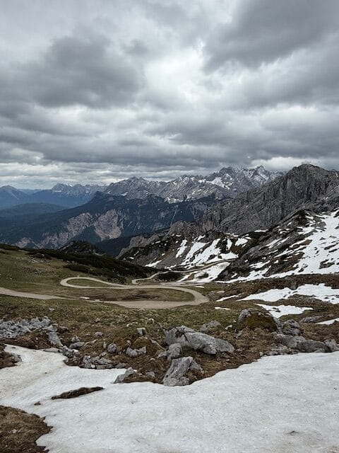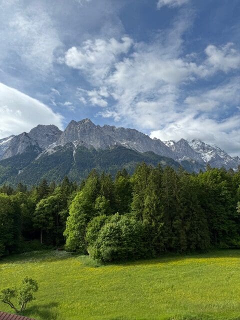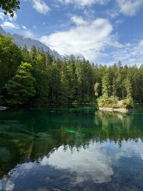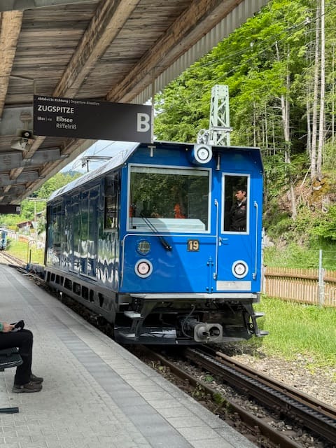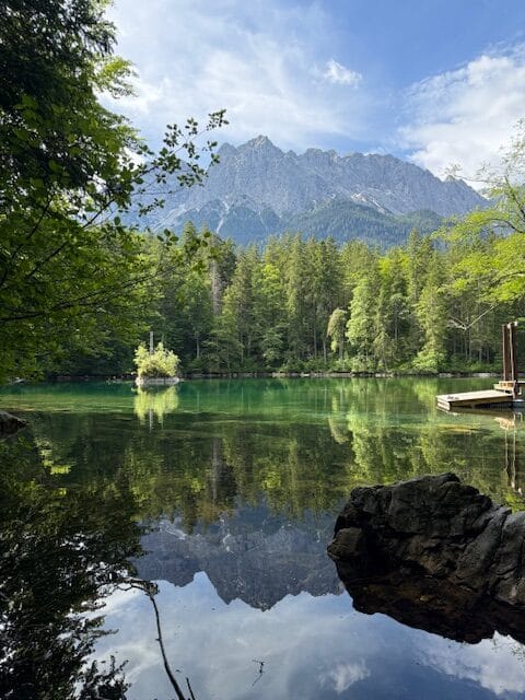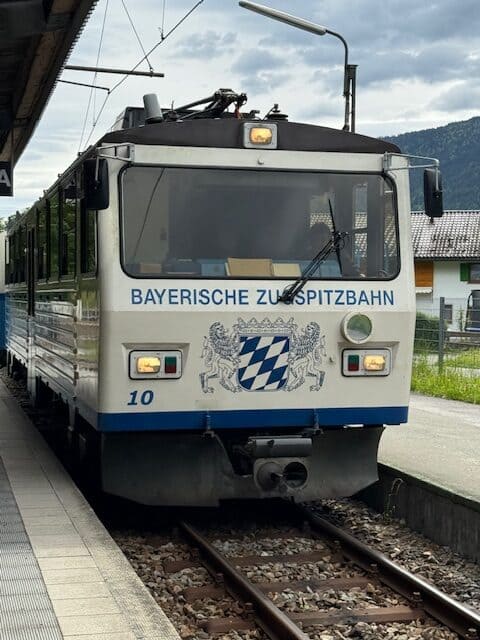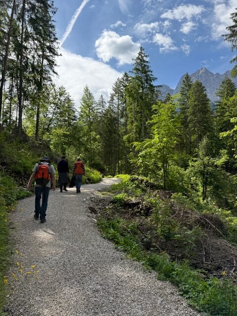 On part à pied ce matin, avec du soleil ! On va jusqu’à la petite gare de Grainau, en passant par la forêt et au bord d’un petit lac; on prend un train à crémaillère.