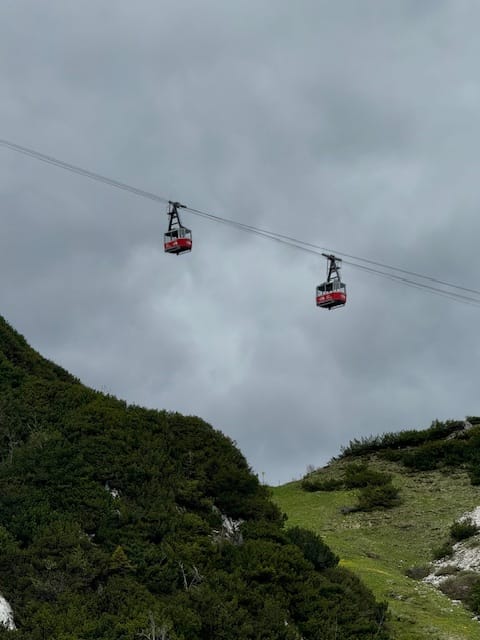 2 stations et on arrive à la gare où se trouve le téléphérique. On ne peut pas accéder au Zugspitze (fermé jusqu’à ce soir), mais on peut accéder au ALPSPITZE. Ce sommet est à 2600m, le téléphérique s’arrête à 2000m. La montée est très impressionnante : le début est au-dessus des sapins, mais après on monte rapidement et on se retrouve au-dessus du vide.
