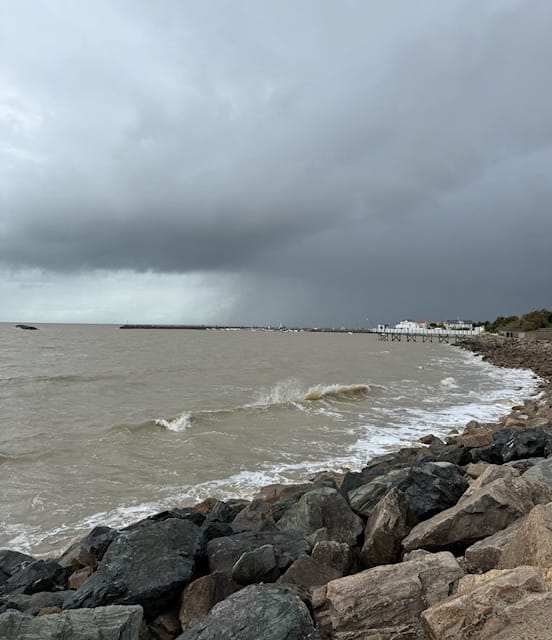 En arrivant, on est sorti faire un tour le long de l’océan, mais on s’est pris une grosse averse avec beaucoup de vent… on est rentrés trempés! L’océan est quasiment marron, le ciel est gris foncé et le vent souffle en rafales.