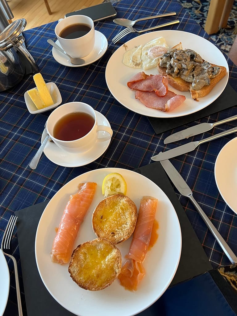 Petits pains grillés et saumon d’Ecosse fumé ; champignons à la crème sur toast grillé, bacon, oeuf au plat