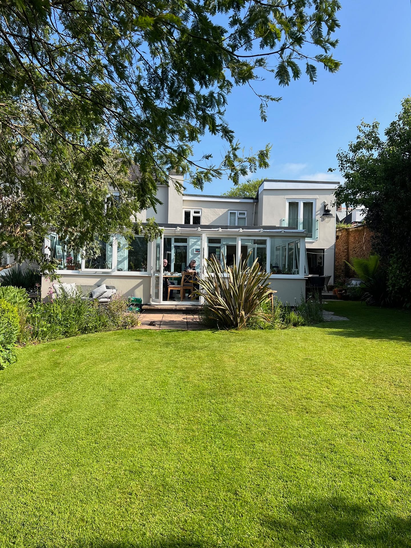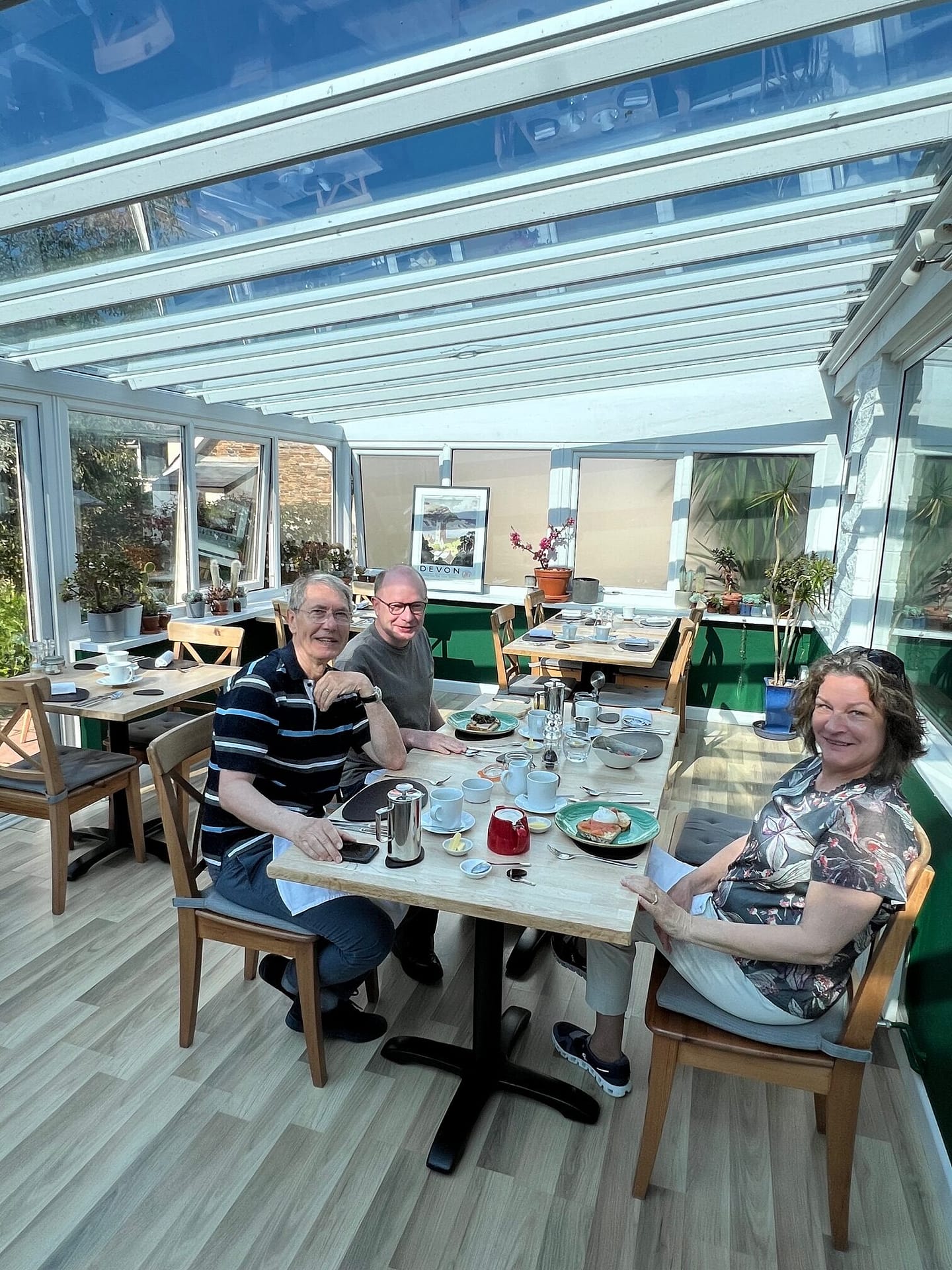 Excellent petit déjeuner ce matin dans notre B&B, dans une véranda donnant sur le jardin.