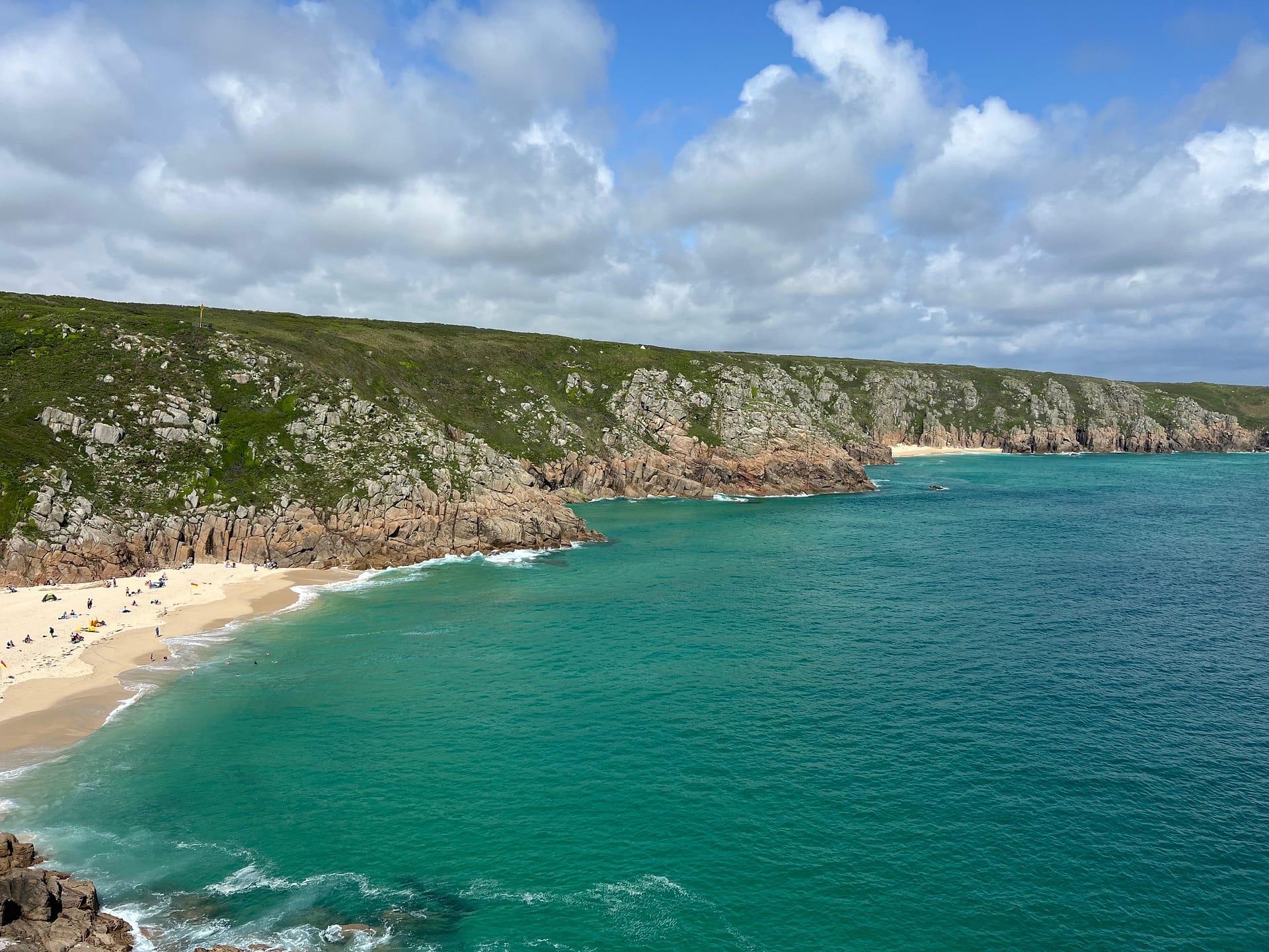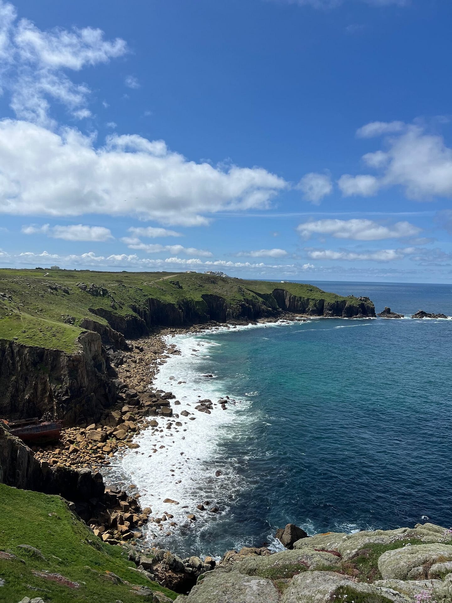 Puis départ vers l’ouest: LAND’S END, c’est le point le plus à l’ouest de l’Angleterre. Pour y aller, on se gare environ 2km plus loin, à SENNEN COVE HARBOUR. La balade le long du sentier côtier est magnifique: ce sont des falaises incroyables et des très belles couleurs.