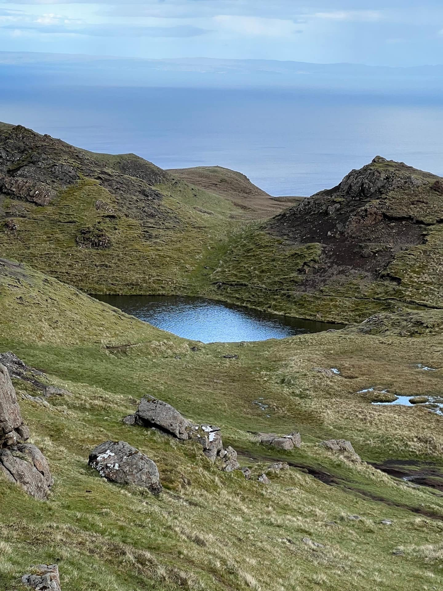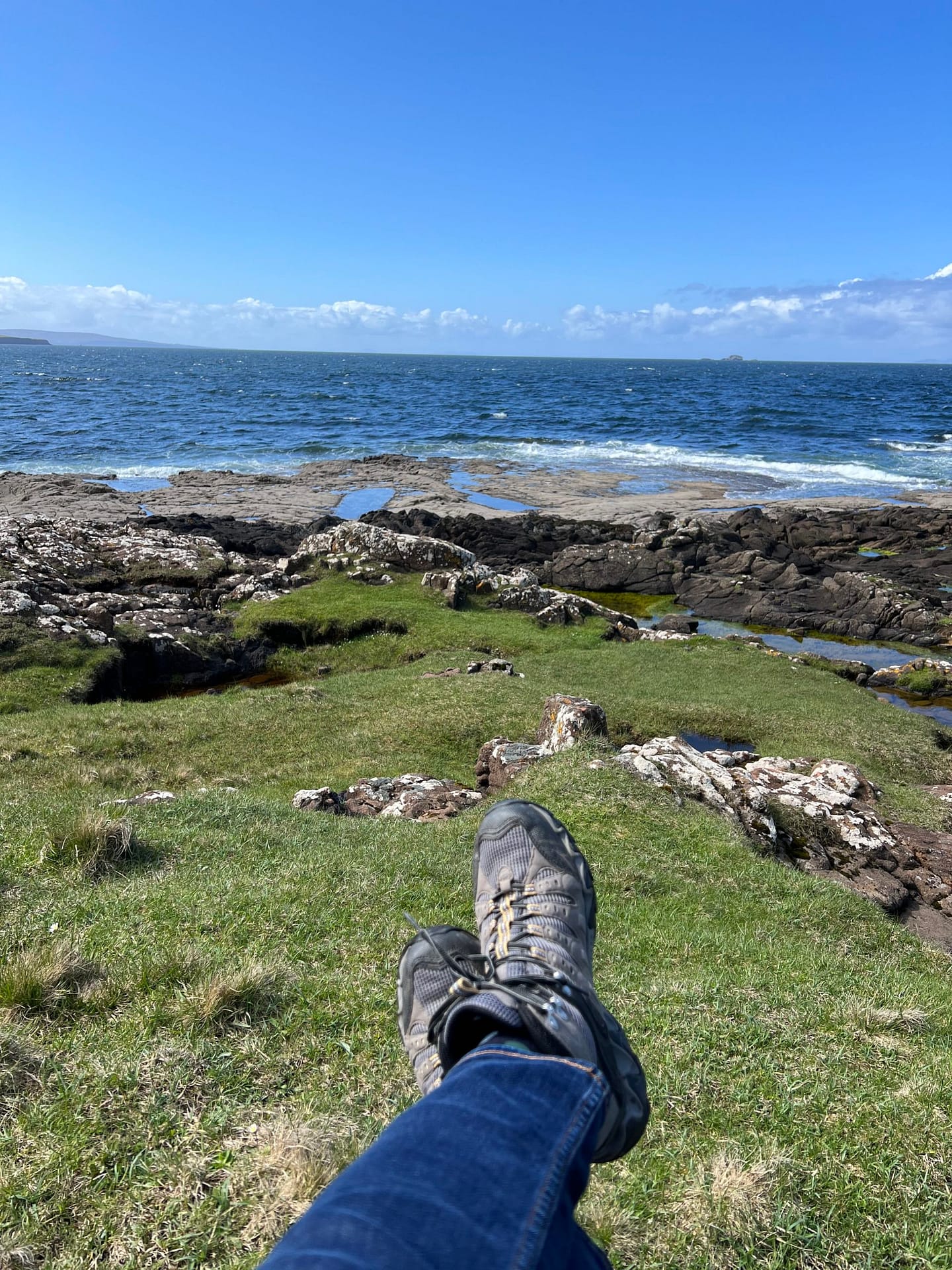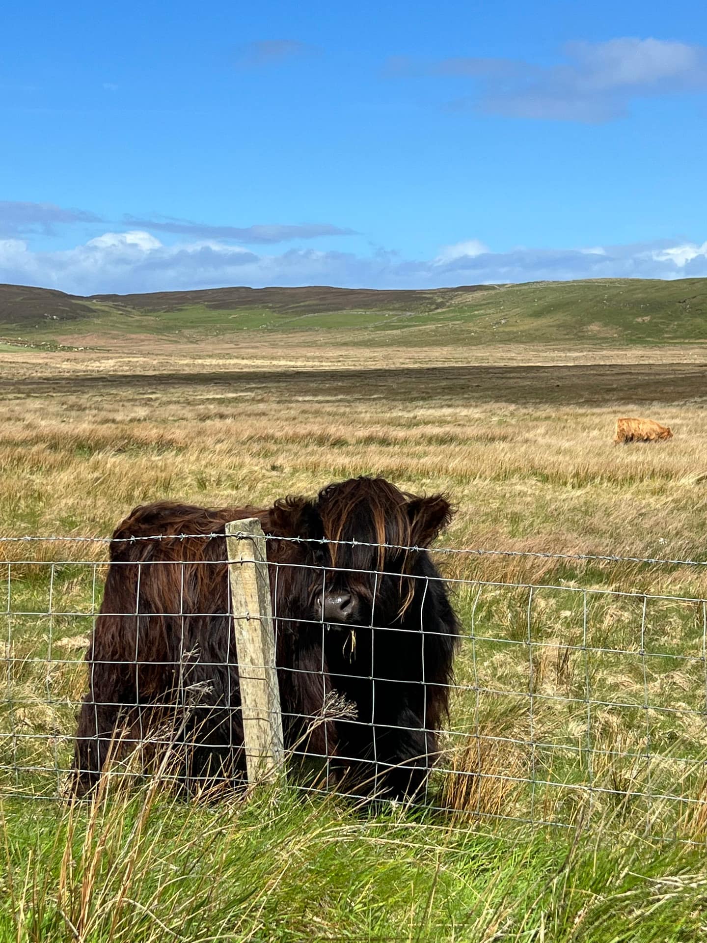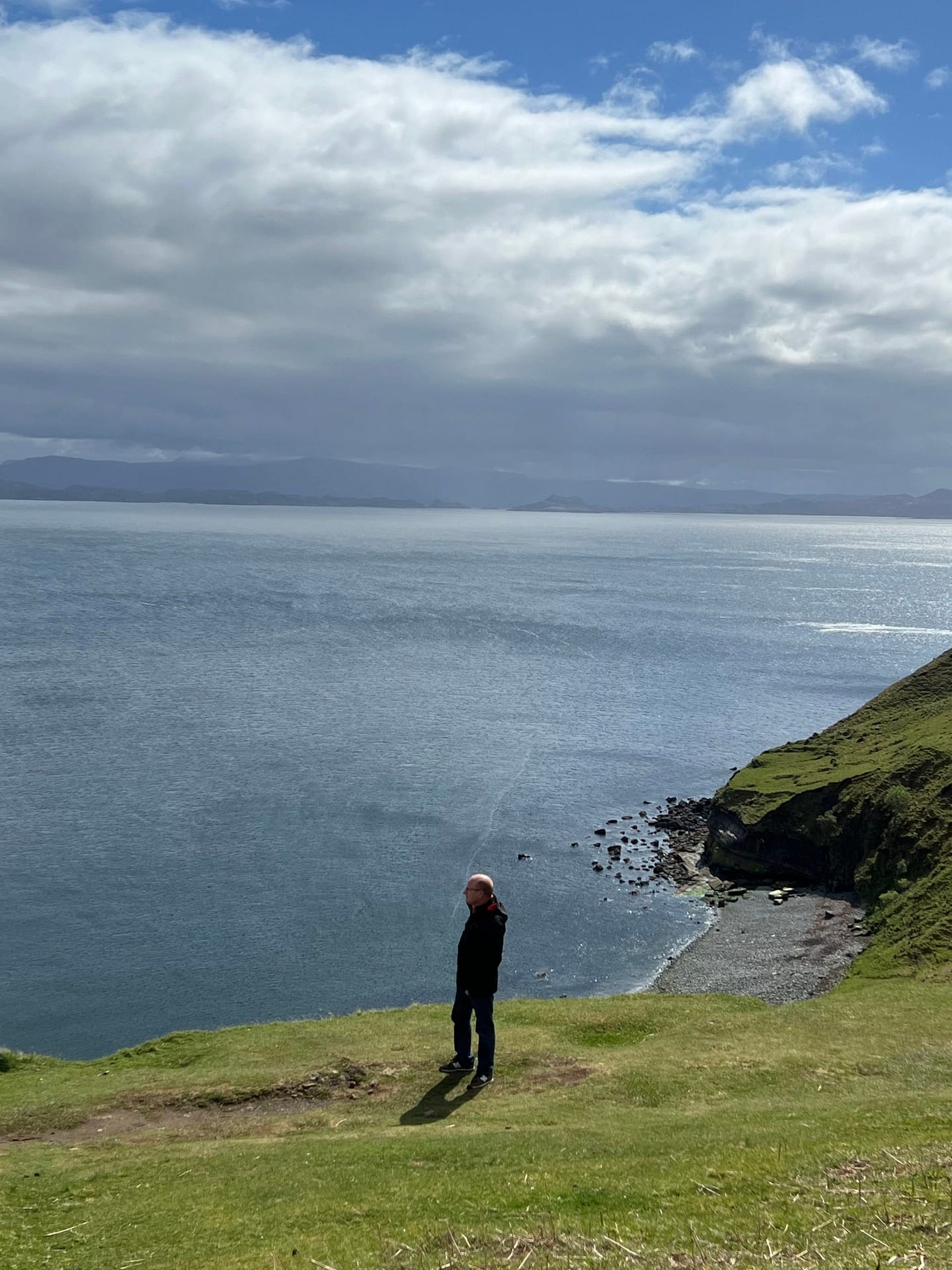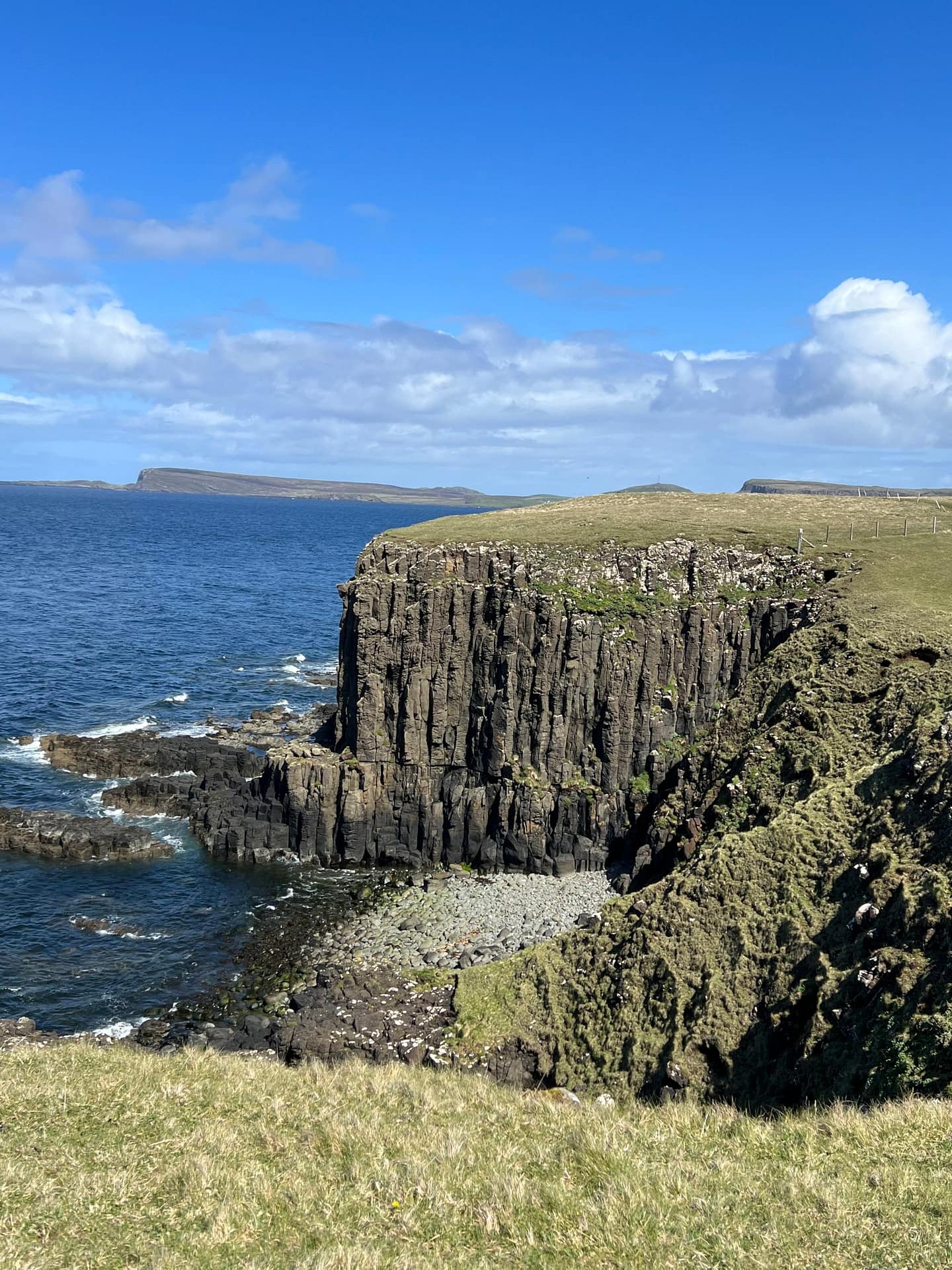On poursuit la route le long de la côte. On s’arrête pour aller à pied à travers les prés le long des falaises, au niveau de KILMUIR : paysages à couper le souffle !