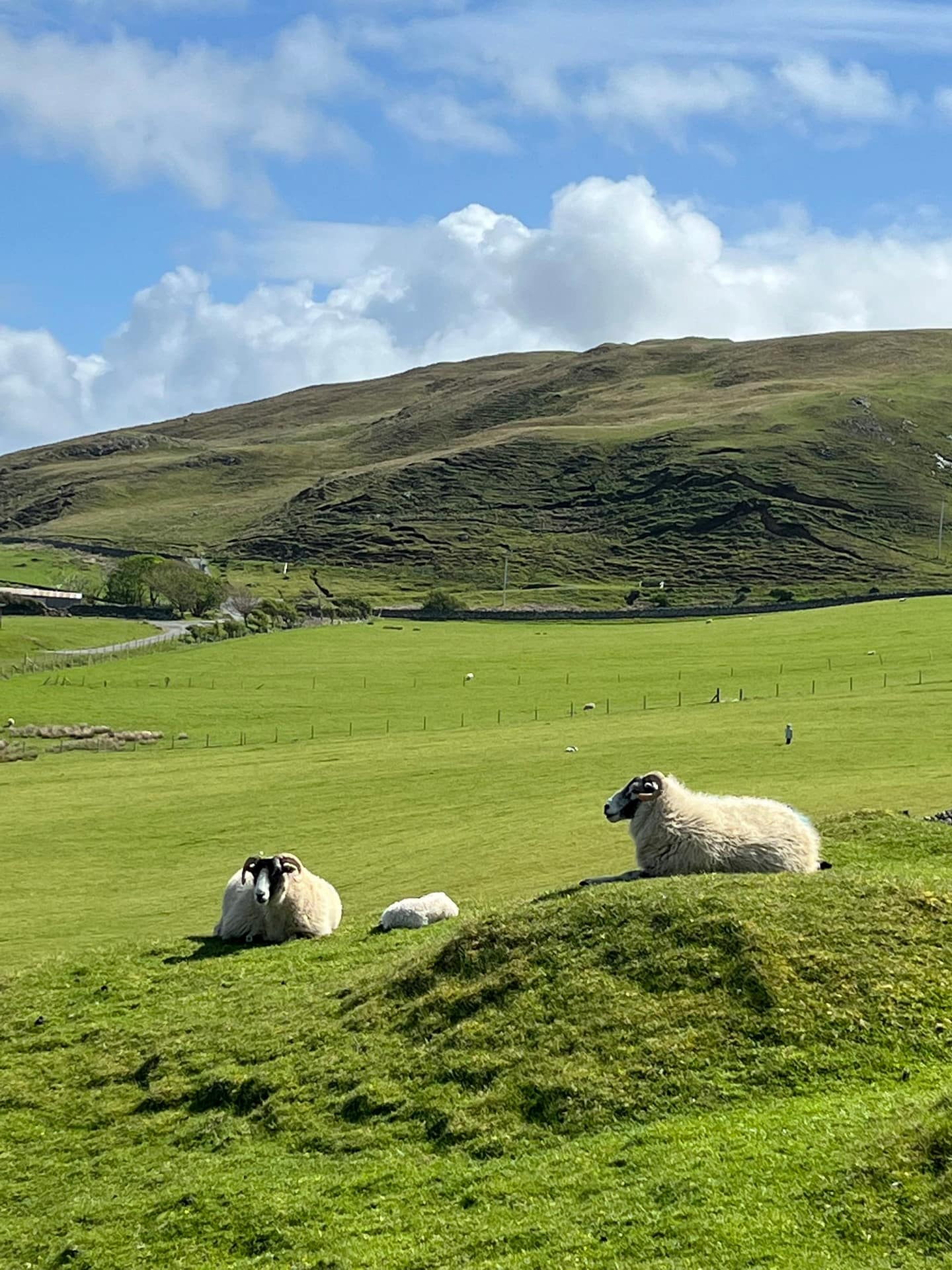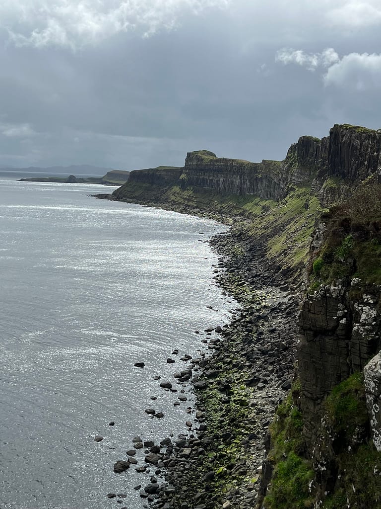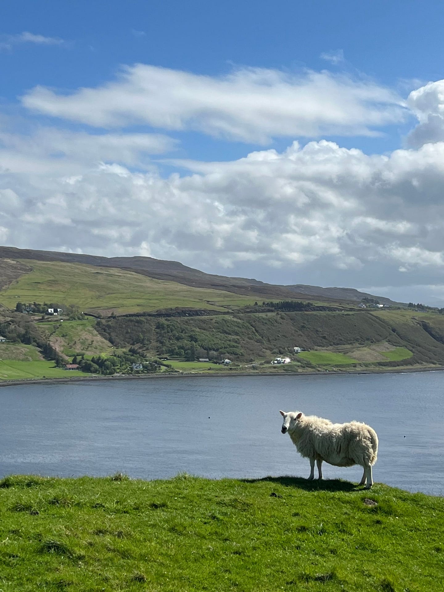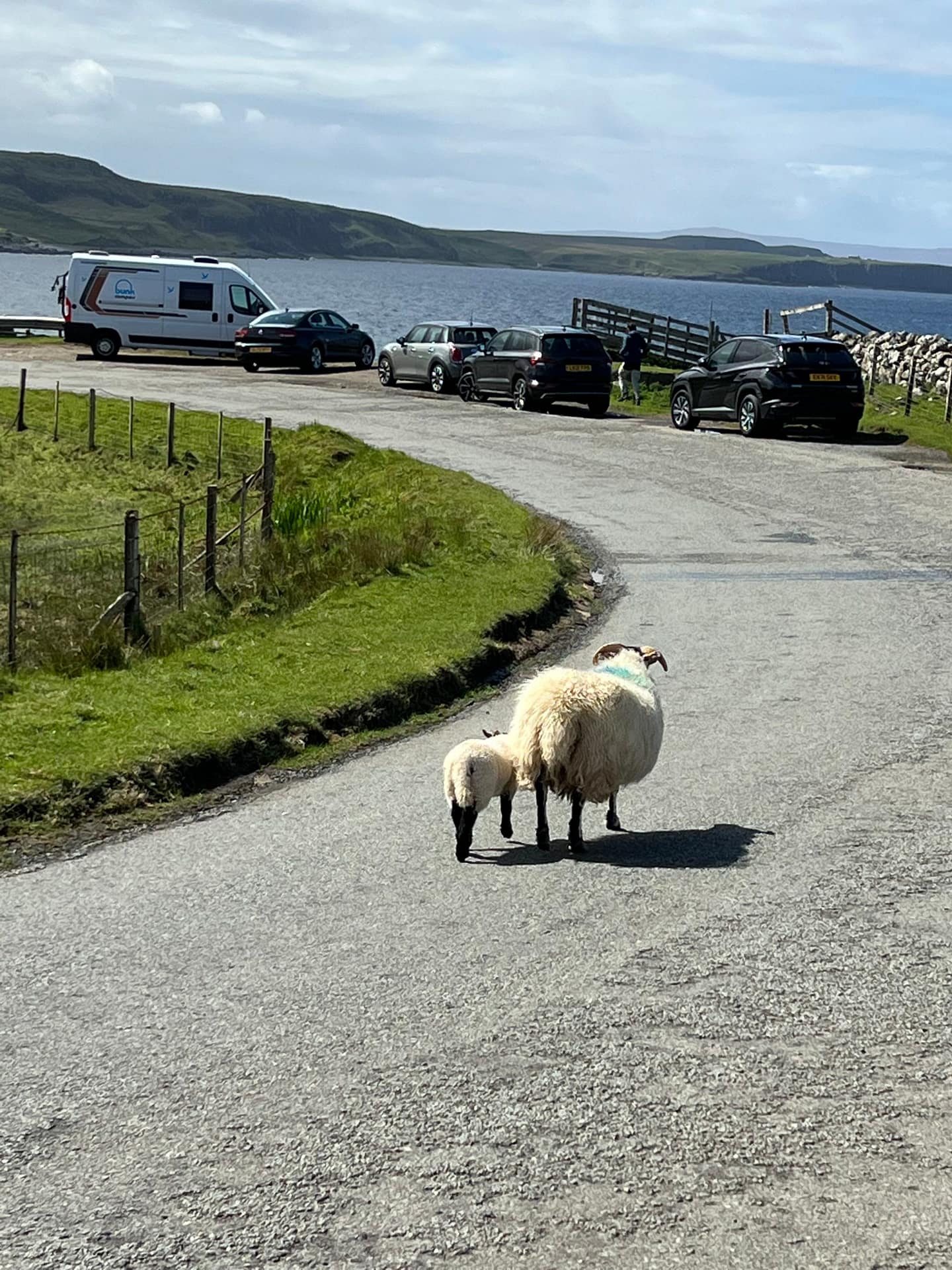 Puis nous partons direction Old Man of Storr : mais il pleut, on décide de revenir pus tard. On poursuit sur la route qui contourne la péninsule : avec des points de vues époustouflants sur les falaises ! et des moutons sur la route…
