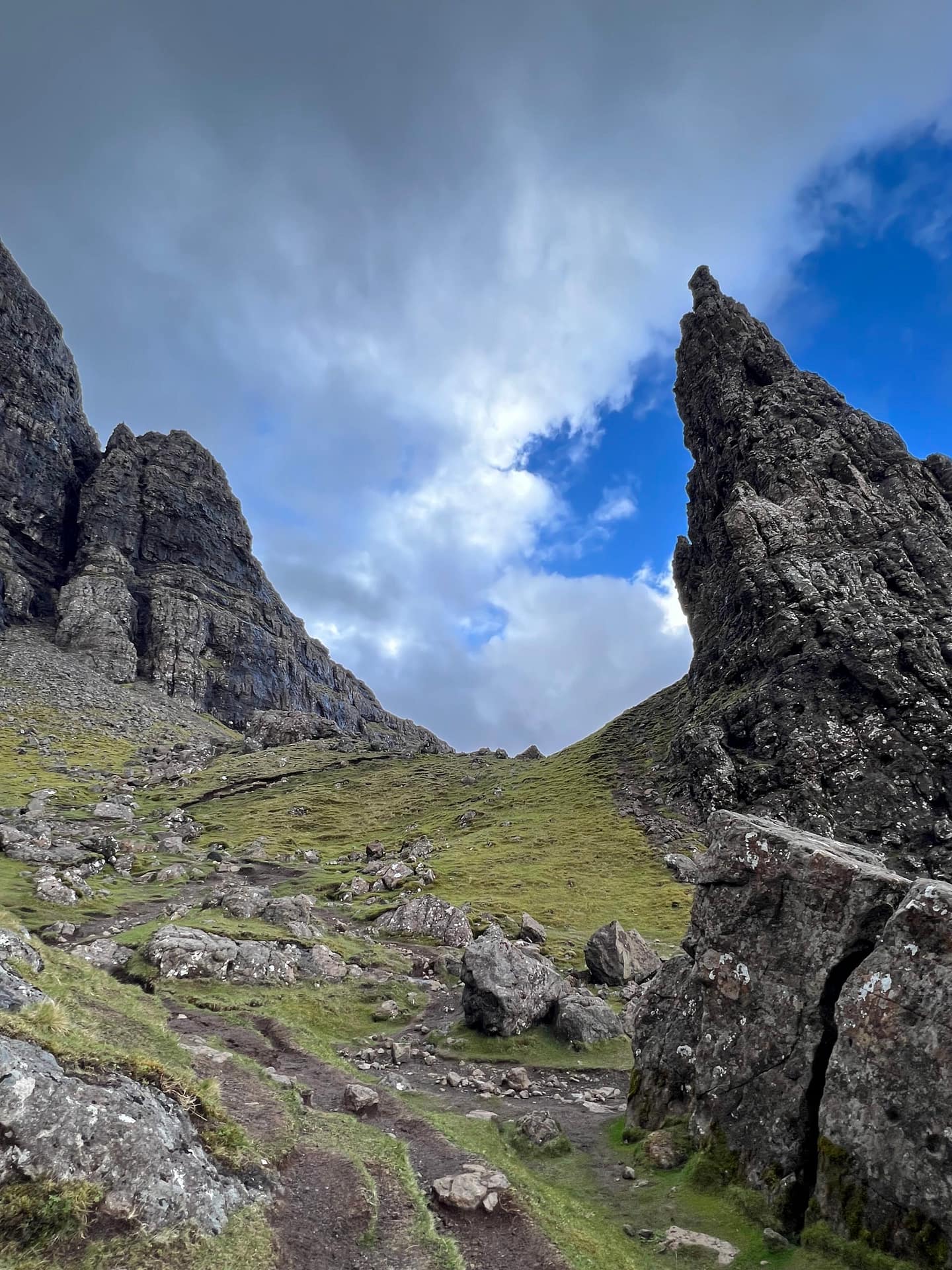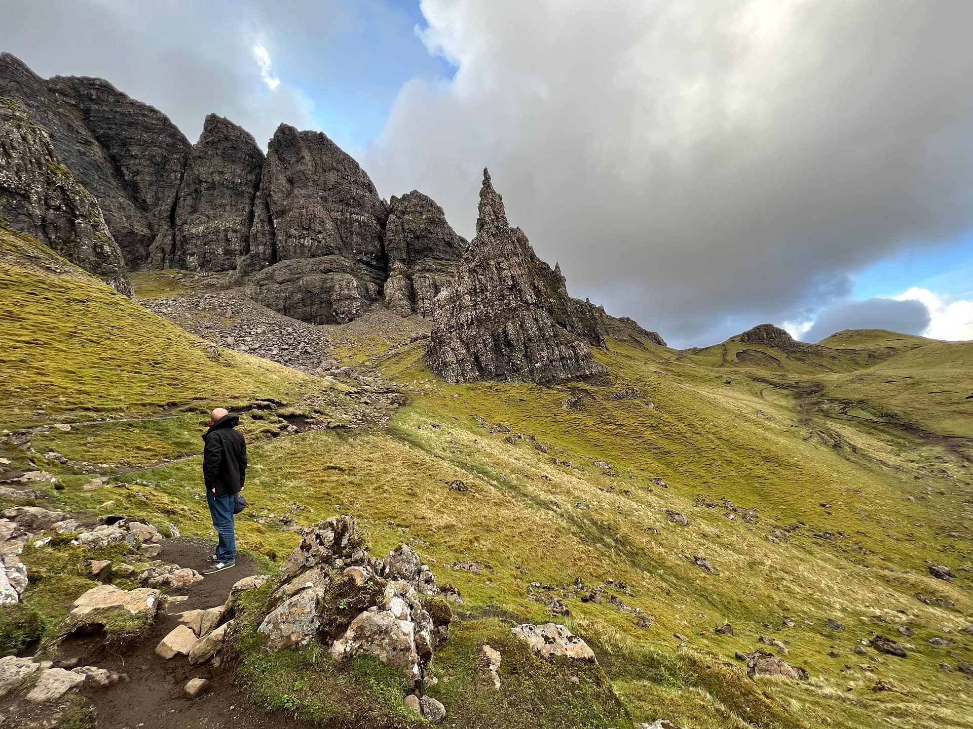 Le temps est calme : on retourne au OLD MAN OF STORR : aiguille de basalte de 50m de haut (on la voit depuis notre logement…). La montée est raide mais la vue est splendide, et une fois en haut c’est absolument magique!