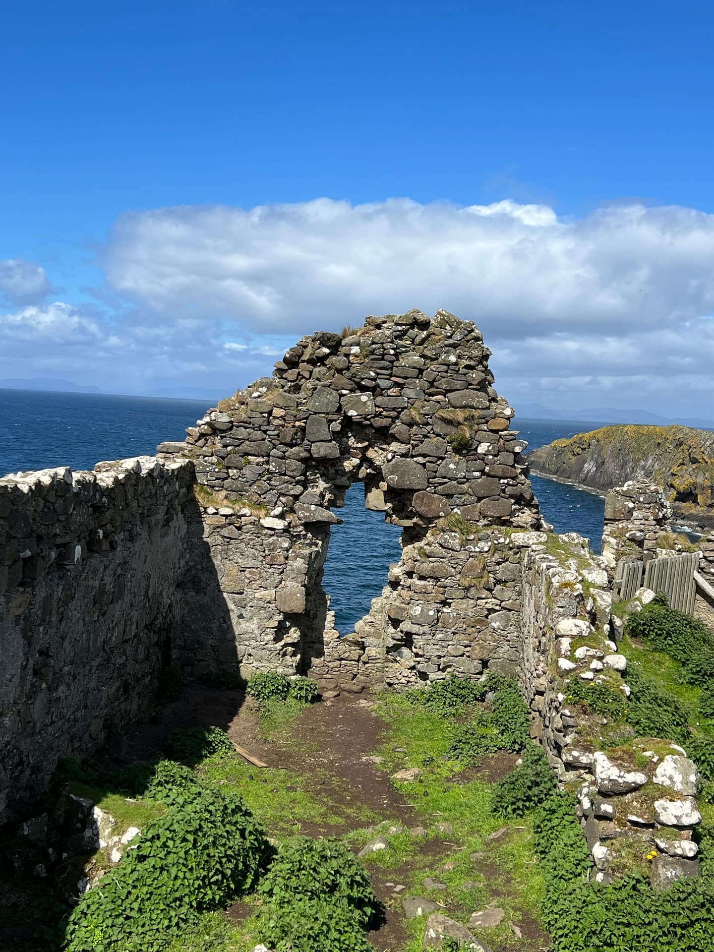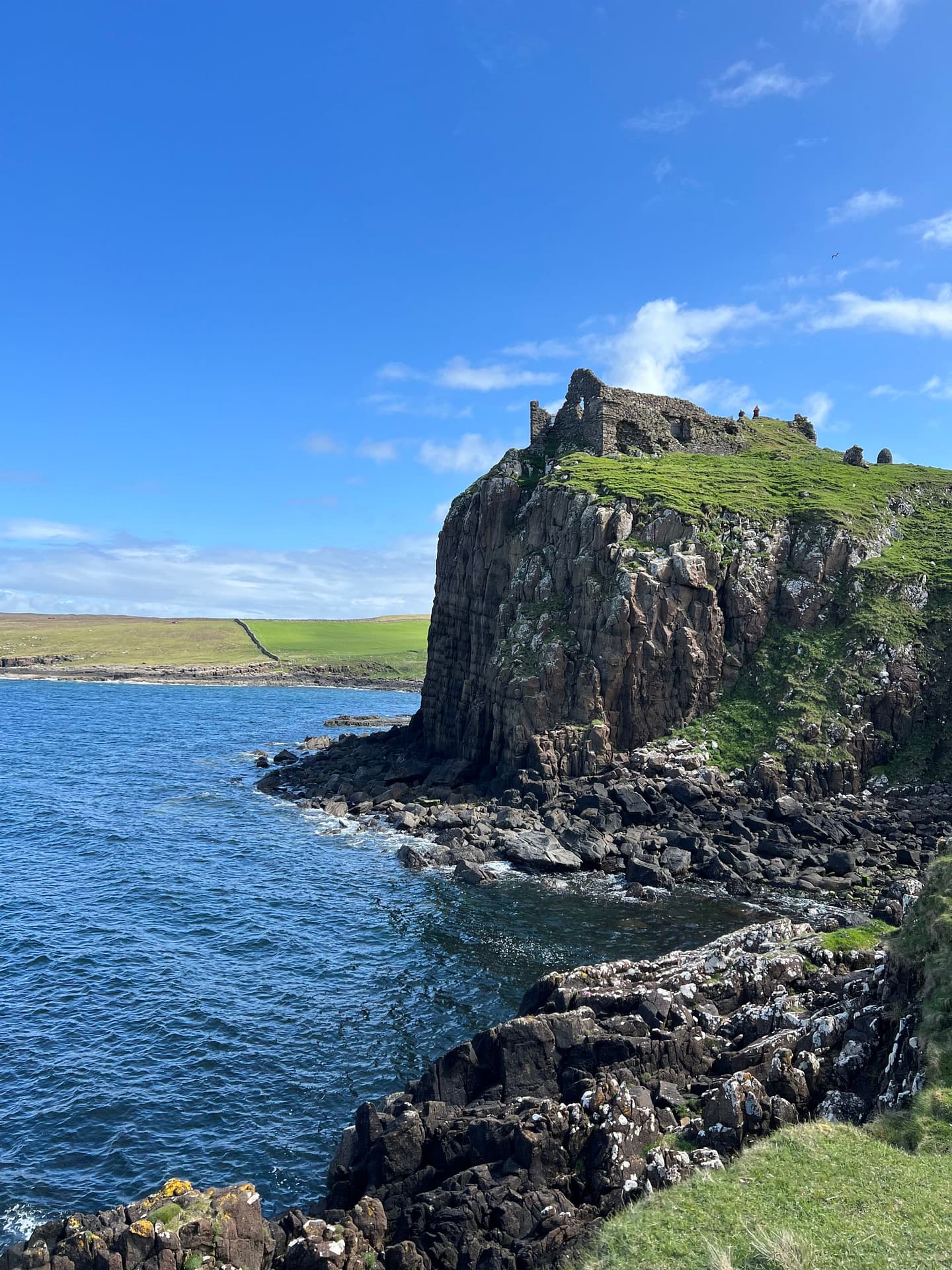 On s’arrête plus longuement au château DUNTLUM, ruines d’une place forte du XVe siècle bâtie par le clan MacDonald pour surveiller la route maritime des Hébrides extérieures. On se balade sur les pentes herbeuses, avec les moutons. On pique nique sur place.