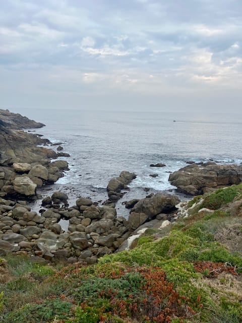 Ce matin le temps est gris. Mais après le petit déjeuner, on décide d’aller quand même faire une randonnée dans le coin. On a marché 2h: 30 minutes au sec, 30 minutes avec quelques gouttes, et 1h sous la pluie… on est rentrés trempés ! mais bien contents de la marche, le sentier est beau avec de belles vues sur la mer et des beaux coins en forêt. On a dû raccourcir et rentrer plus vite que prévu à cause de la pluie.