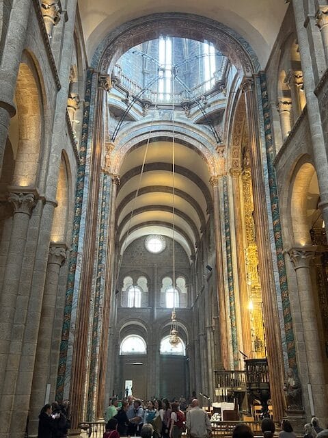 1er arrêt à ST JACQUES DE COMPOSTELLE. Il y a du monde, beaucoup de pèlerins, et 45 minutes d’attente pour entrer dans la cathédrale. On a vu les pèlerins sortir, et quand on est entrés, il y avait une forte odeur d’encens: ils ont dû être bénis avec le grand encensoir.