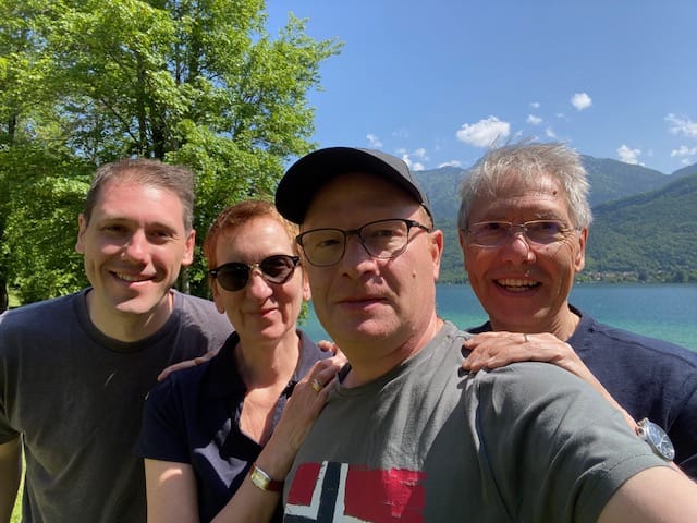 On se lève plus tôt aujourd’hui car Frank et Francis veulent partir pas trop tard. Petit déjeuner sur la terrasse couverte au bord du lac. Puis c’est le départ: Frank et Francis prennent la route vers l’Allemagne, nous partons vers la Suisse et le Jura pour une dernière journée de balade.
